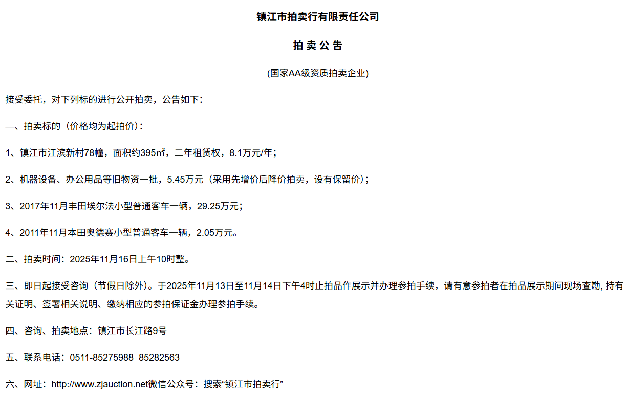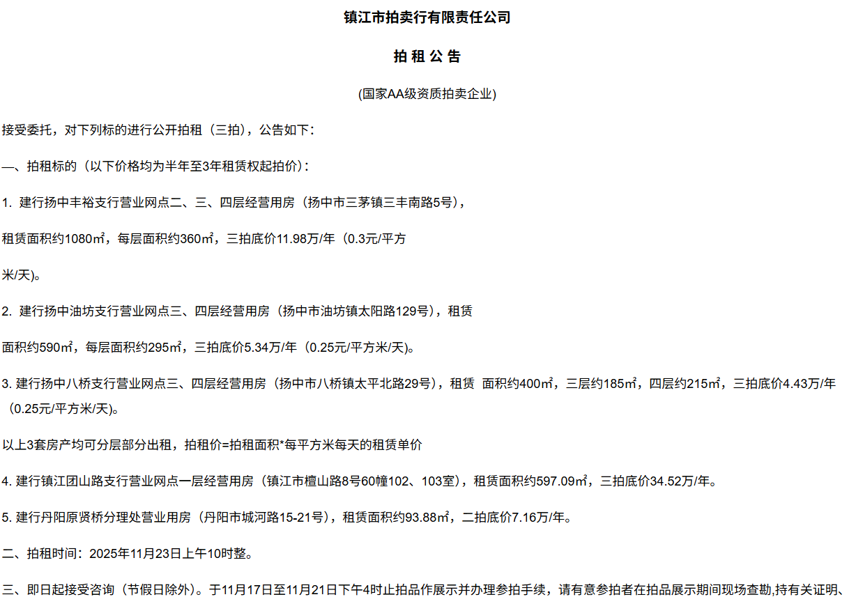 鎮江市拍賣行有限責任公司拍 租 公 吿(國家AA級資質拍賣企業)接受委托,對下列標的進行公開拍租(三拍),公告如下:—、拍租標的(以下價格均為半年至3年租賃權起拍價):1.  建行揚中豐裕支行營業網點二、三、四層經營用房(揚中市三茅鎮三豐南路5號),租賃面積約1080㎡,每層面積約360㎡,三拍底價11.98萬/年(0.3元/平方米/天)。2.  建行揚中油坊支行營業網點三、四層經營用房(揚中市油坊鎮太陽路129號),租賃面積約590㎡,每層面積約295㎡,三拍底價5.34萬/年(0.25元/平方米/天)。3. 建行揚中八橋支行營業網點三、四層經營用房(揚中市八橋鎮太平北路29號),租賃  面積約400㎡,三層約185㎡,四層約215㎡,三拍底價4.43萬/年(0.25元/平方米/天)。以上3套房產均可分層部分出租,拍租價=拍租面積*每平方米每天的租賃單價4. 建行鎮江團山路支行營業網點一層經營用房(鎮江市檀山路8號60幢102、103室),租賃面積約597.09㎡,三拍底價34.52萬/年。5. 建行丹陽原賢橋分理處營業用房(丹陽市城河路15-21號),租賃面積約93.88㎡,二拍底價7.16萬/年。二、拍租時間:2025年11月23日上午10時整。三、即日起接受咨詢(節假日除外)。于11月17日至11月21日下午4時止拍品作展示并辦理參拍手續,請有意參拍者在拍品展示期間現場查勘,持有關證明、簽署相關說明、繳納相應的參拍保證金辦理參拍手續。四、咨詢、拍租地點:鎮江市長江路9號五、聯系方式:0511-85275988   13655299933楊先生六、網址:http://www_zjauction_net.ausuke.com;微信公眾號:搜索“鎮江市拍賣行” 拍品清單2025.11.23序號名稱起拍價(元)標的說明1建行揚中豐裕支行營業網點二、三、四層經營用房(揚中市三茅鎮三豐南路5號),租賃面積約1080㎡,每層面積約360㎡三拍底價11.98萬/年(0.3元/平方米/天)1、1-3號房產均可分層部分出租,拍租價=拍租面積*每平方米每天的租賃單價;2、意向競拍人在拍賣前需持營業執照或身份證與委托方說明租賃房產經營業態,確定意向后出具房產承租用途承諾書,經委托方審核后,方可交納保證金參加競拍;3、租賃期限為半年至3年(承租方與出租方協商而定),承租方每半年或一年結付租金,租賃期間的水、電費用及其它相關費用均由承租方承擔;4、承租方不得用于經營和保管危險物品,不得用于開設餐飲、娛樂等可能嚴重影響消防安全、運營安全的經營業態,不得用于經營委托貸款、小額貸款等可能冒用委托方名義,帶來聲譽風險的經營業態。租賃期內,承租方不得破壞墻體結構,自行成就消防、安全等使用條件,不得擅自將租賃房屋轉租、轉讓給他人使用,否則委托方有權收回房屋;5、拍租成交后,承租方將租金交至出租方指定賬戶,傭金交至拍賣方賬戶(拍租傭金為該房屋一個月租金)。承租方憑租賃合同無息退還保證金。2建行揚中油坊支行營業網點三、四層經營用房(揚中市油坊鎮太陽路129號),租賃面積約590㎡,每層面積約295㎡三拍底價5.34萬/年(0.25元/平方米/天)3建行揚中八橋支行營業網點三、四層經營用房(揚中市八橋鎮太平北路29號),租賃面積約490㎡,每層面積約245㎡三拍底價4.43萬/年(0.25元/平方米/天)4建行鎮江團山路支行營業網點一層經營用房(鎮江市檀山路8號60幢102、103室),建筑面積約597.09㎡三拍底價34.52萬/年5建行丹陽原賢橋分理處營業用房(丹陽市城河路15-21號),建筑面積約93.88㎡二拍底價7.16萬/年